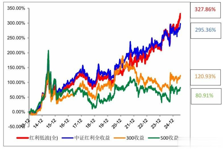 从长期投资的角度来看,红利低波指数的表现同样令人瞩目。红利低波全收益指数自发布以来的累计收益率达到327.86%,这一数据不仅高于传统红利类指数(中证红利),也高于同期的市场主要宽基指数。历史长期业绩的稳健性充分证明了红利低波指数的投资价值,它能够在不同的市场环境下保持相对稳健的增长,无论是对于长期投资者还是对于追求稳健收益的投资者来说,红利低波指数都具有很大的吸引力。